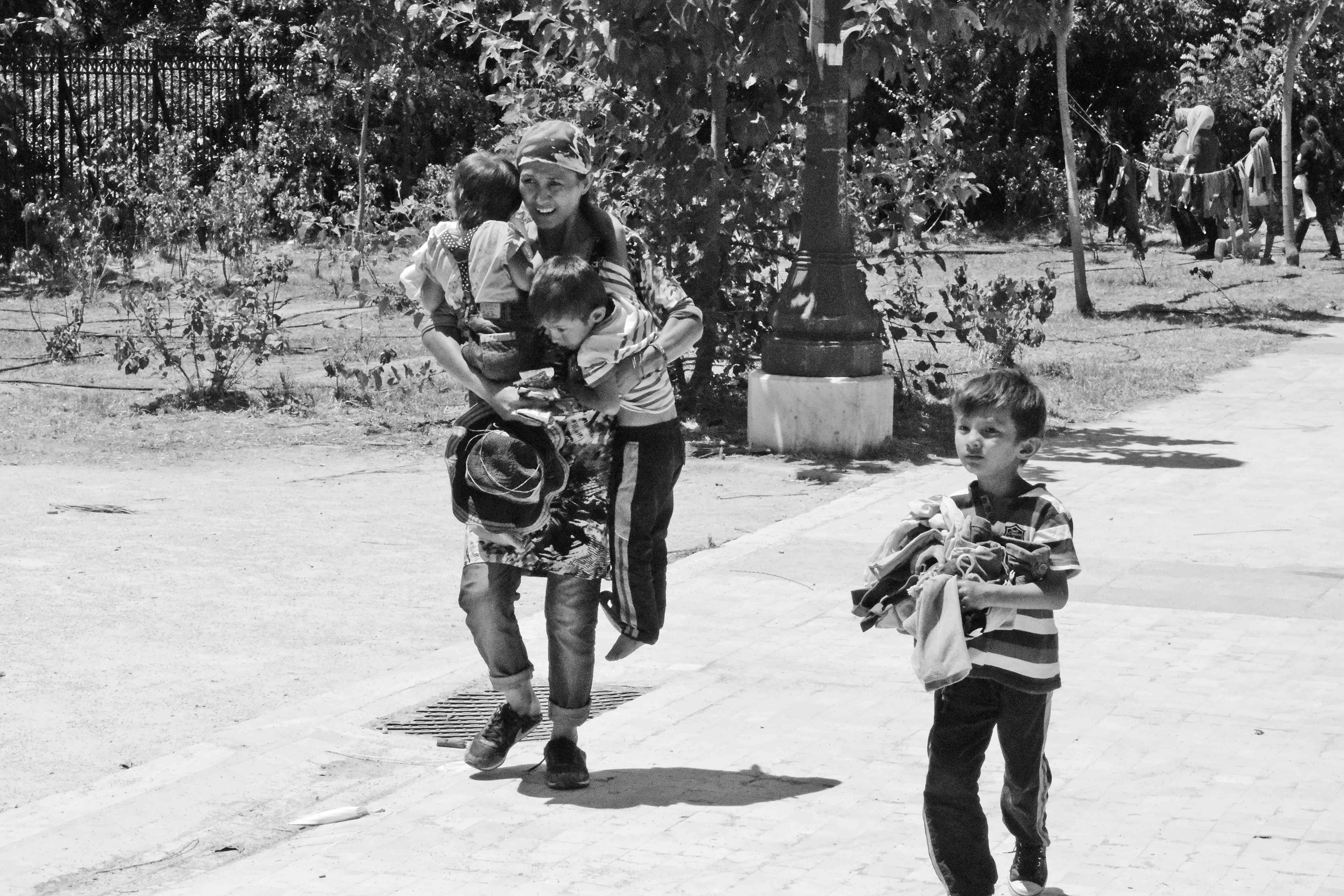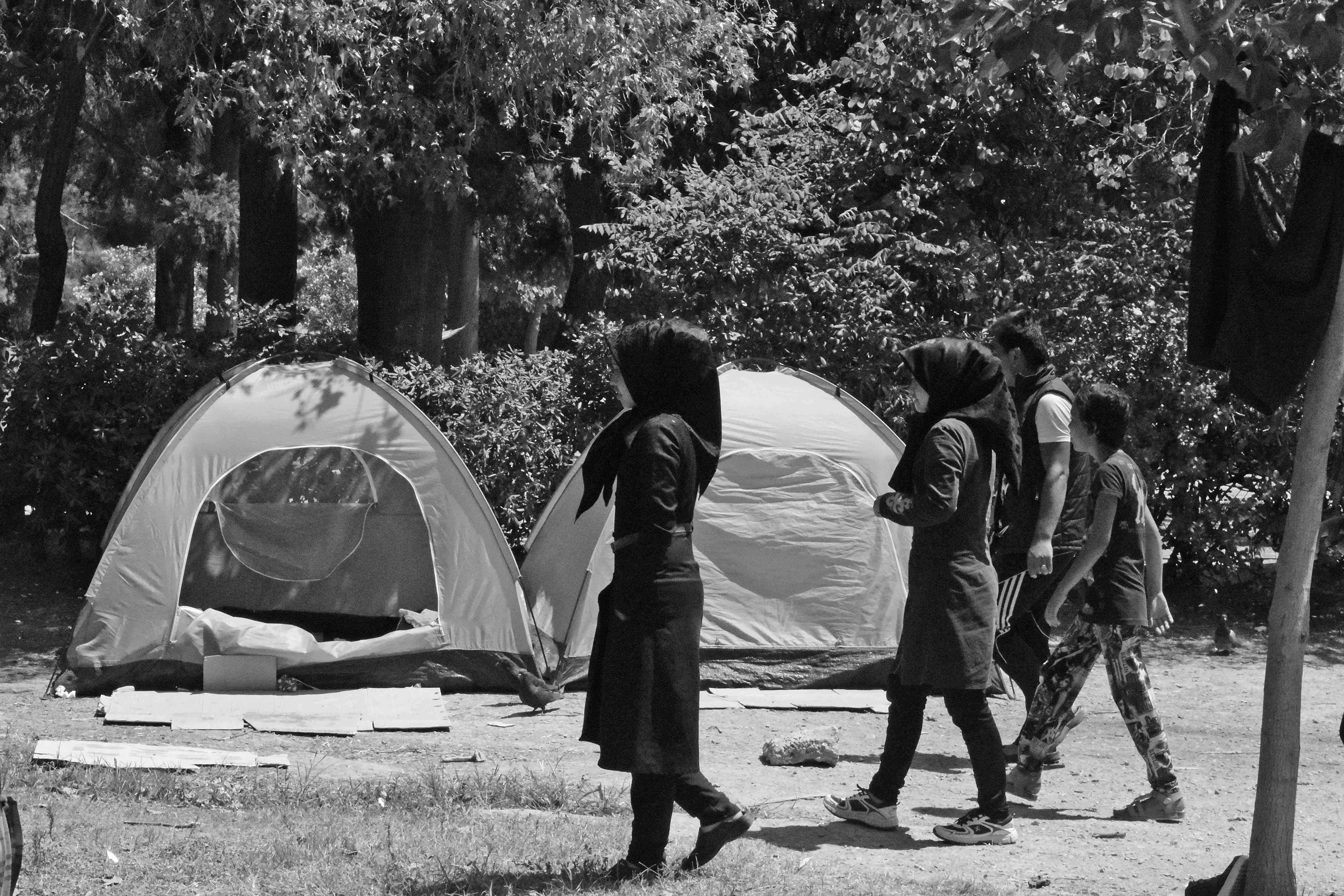 « On a pas d’eau potable ! On boit par ce robinet sale ! Les enfants sont malades ! On manque de nourriture ! On ne sait pas quoi faire ». Paroles d’une mère afghane au parc Athénien « Pedion tou Areos » ou Champ de Mars, par cette chaude journée de juillet. Voilà déjà une semaine que près de 300 personnes ont trouvé refuge entre les bustes des héros grecs de la révolution de 1821. Des tentes, des sacs de couchages et même des cartons constituent l’habitat de ces migrants arrivés de Kos. Enfants, parents et grands-parents sont présents sur les lieux, n’ayant pas pu trouver un meilleur refuge. Pourtant, la capitale hellène est dotée de structures d’accueil pour réfugiés. Dans l’enceinte du parc, une nuée de bambins court, suivie de leurs mères, vers l’une des entrées : un groupe de personnes arrive avec des sacs de nourriture, d’eau et de vêtements. La joie laisse place pourtant au chaos : enfants et adultes se ruent sur les vivres et emportent tout ce qu’ils peuvent pour leurs proches. Ce ne sont que des quidams qui apportent un semblant d’aide à ces gens.