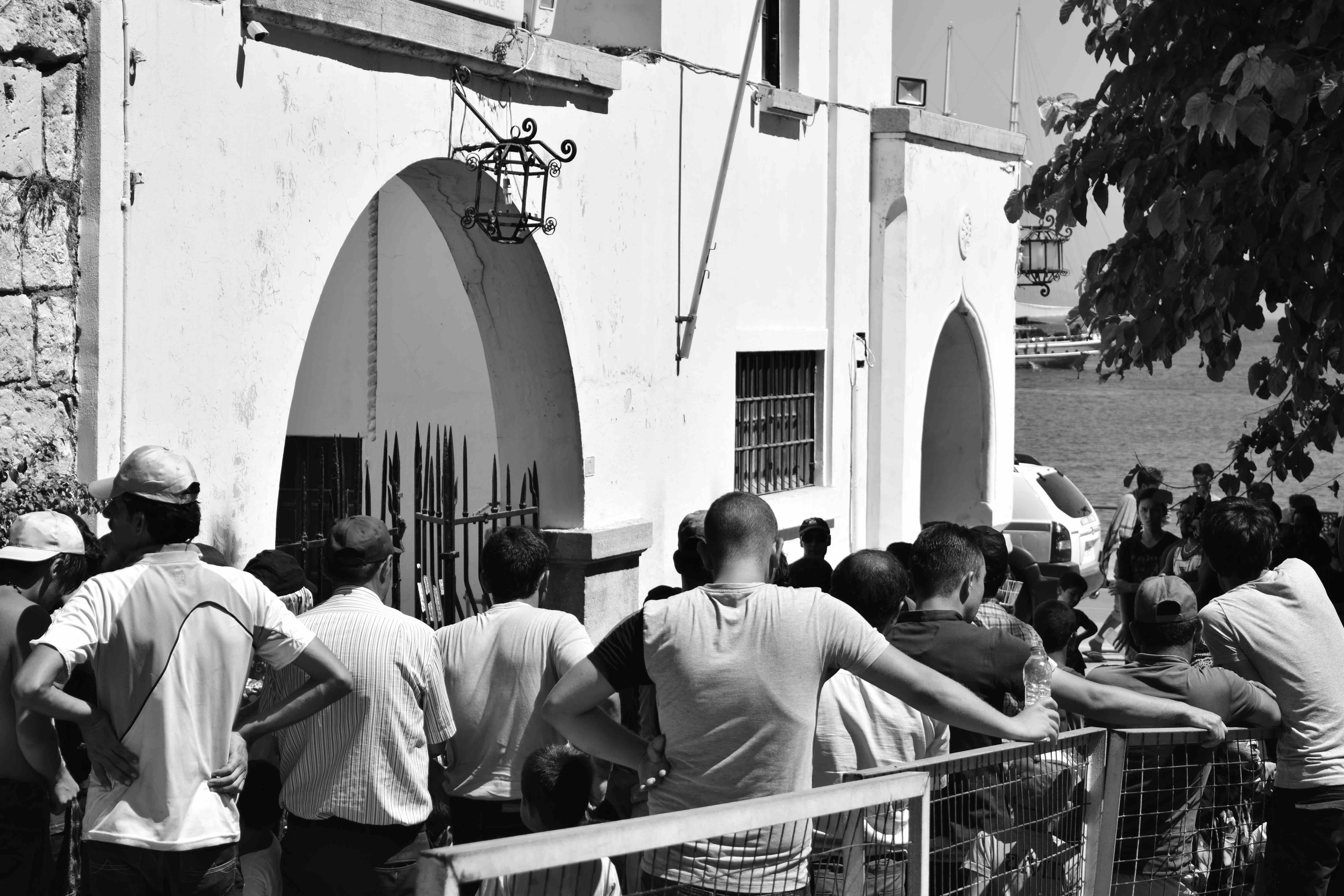 Devant le poste de police, une centaine de personnes attendent de pouvoir entrer et se faire enregistrer. Afin d’éviter des confrontations, trois policiers anti-émeute sont placés devant la grille du poste. « Voilà déjà cinq jours que je suis là… » confie un jeune Syrien, qui veut rester anonyme, « Hier les policiers ont frappé des gens qui n’en pouvaient plus. J’en ai eu marre aussi, je me suis mis derrière, à l’ombre. Je fume pour passer le temps ».