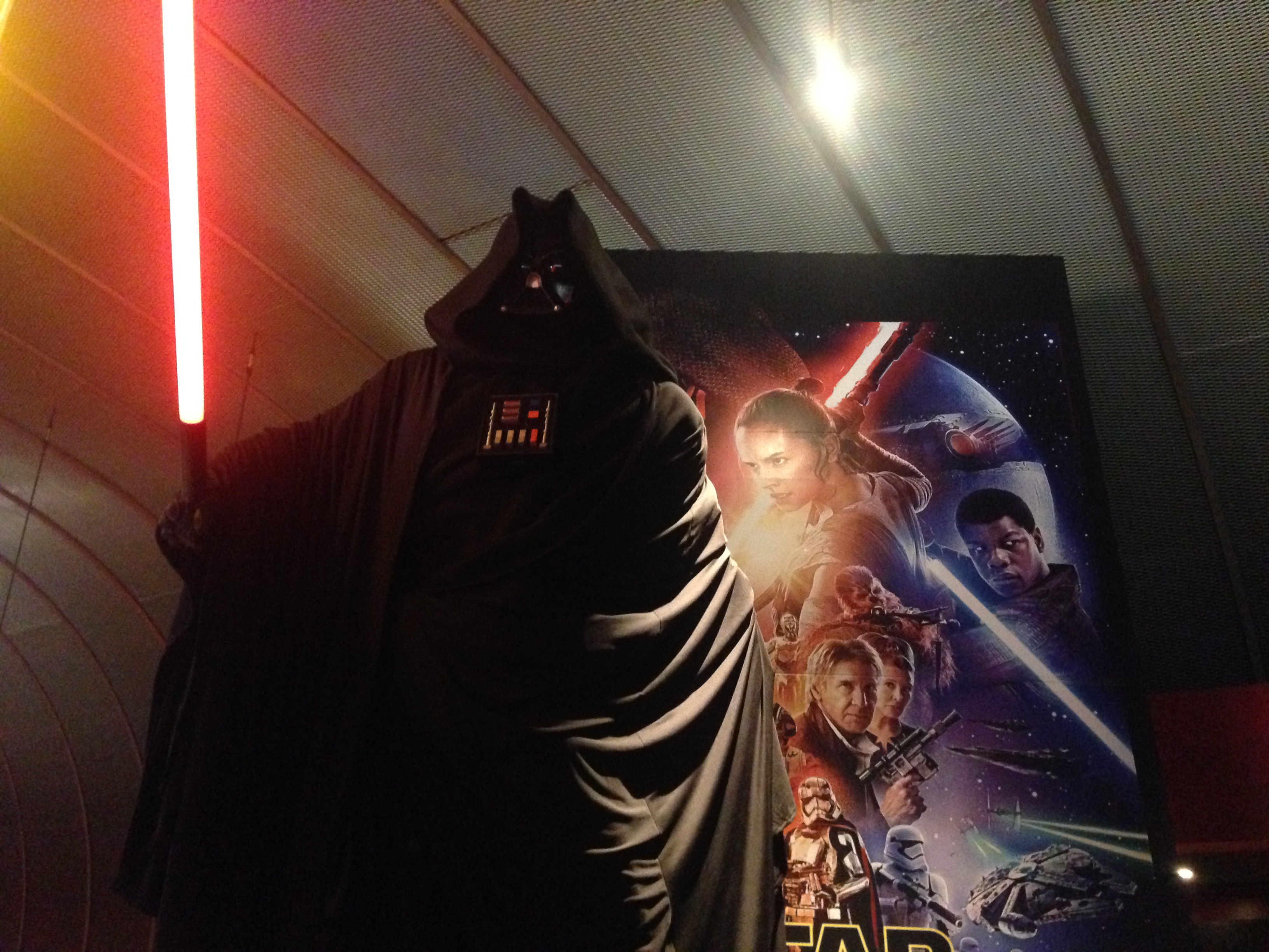Dans la file d’attente pour entrer dans la salle, plus d’une heure avant la projection, ils sont déjà tous là, déguisés, se remémorant la fin de des épisodes précédents. C’est un véritable événement. On voit des Stormtroopers faire des selfies, quelques Dark Vadors, un Kylo Ren plus que réaliste (le méchant de ce nouvel opus) et bien entendu, la majorité est en Jedi. Des batailles de sabres lasers sont organisées en attendant l’ouverture des portes.