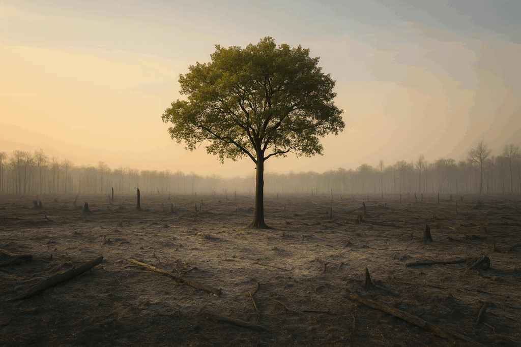 La déforestation représente près de 80 % des émissions de CO₂ du pays. Et pourtant, au milieu des cendres, un arbre résiste. « Moi, l’arbre ancien », semble-t-il dire, « je tiendrai encore, malgré les hommes, malgré les puissants. »