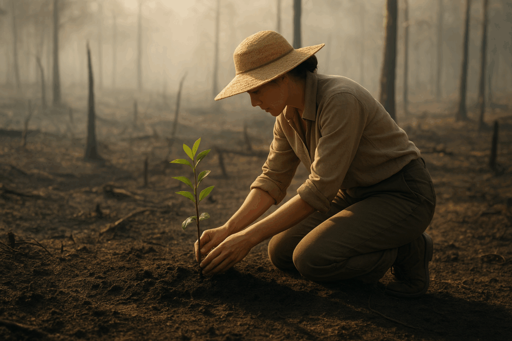Chaque matin, Sumini parcourt ce qui fut jadis un royaume d’arbres. Ses pas foulent les cendres, son regard se voile.